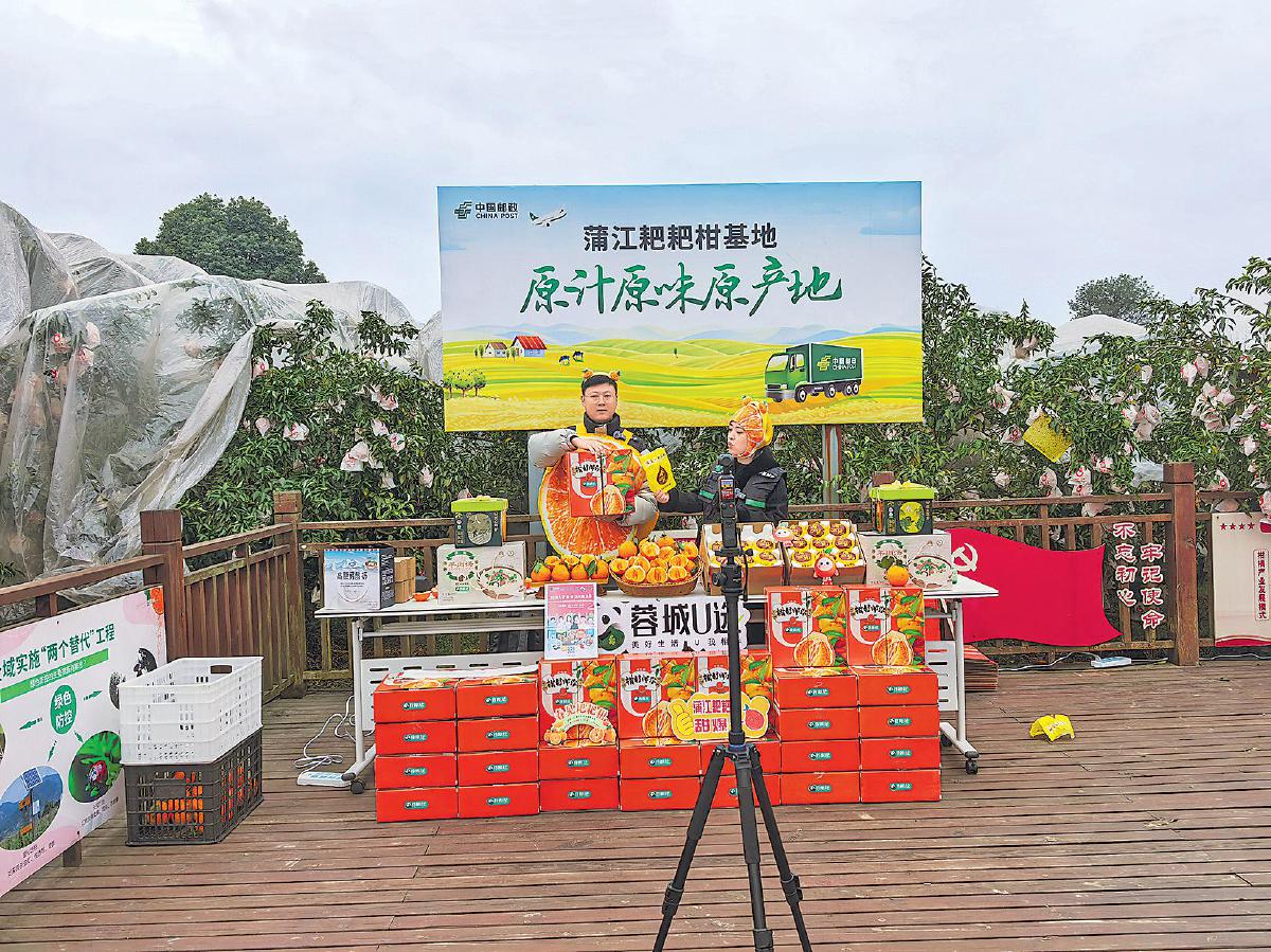 今年1月,在蒲江县柑橘示范基地举办的耙耙柑产地推介会暨线上直播活动中,成都邮政创新采用“产地打造+直播推介+全国认购+现场寄递”的一体化模式,实现线上多平台联动、线下体验同步,达成同频共振。