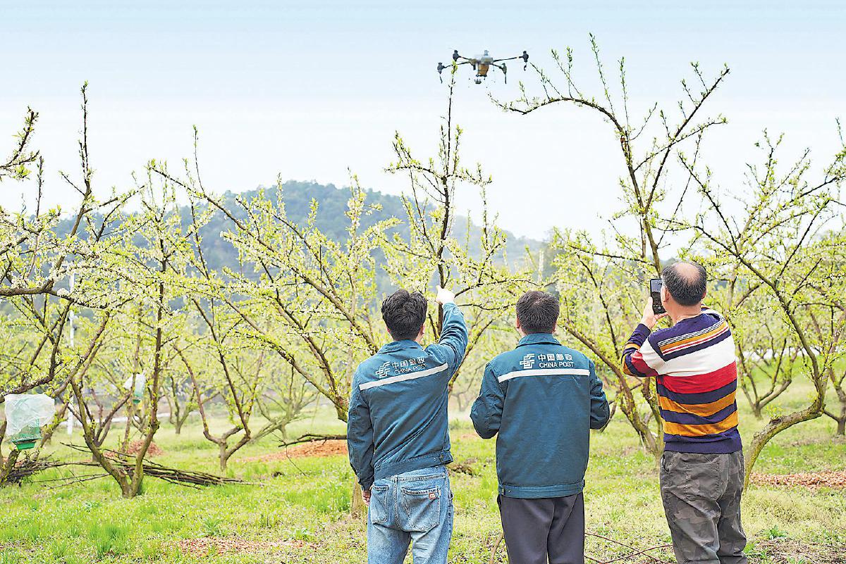 3月12日,江津区邮政分公司工作人员在柰李基地开展无人机植保作业,助力果树增产。 □王春兰 摄
