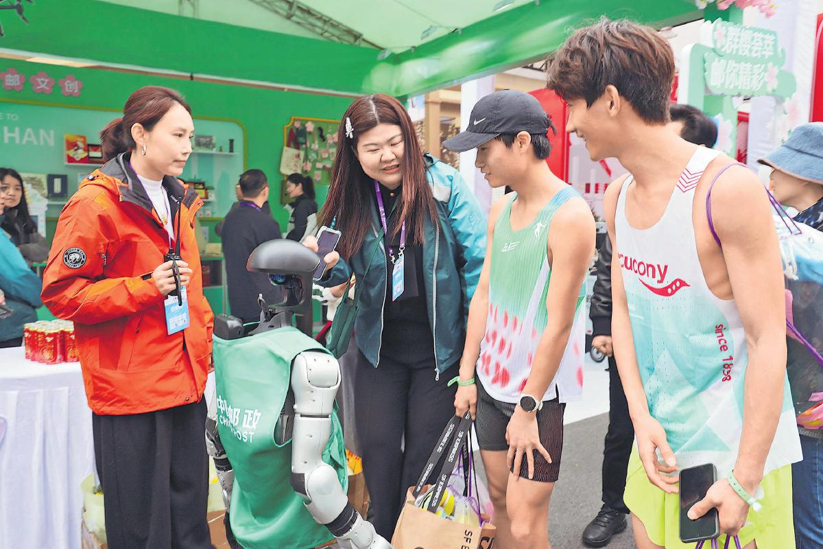 临时邮局里,互动体验区、集章打卡区、文创展示区、跑友休息区一应俱全,多维度、全方位、有温度的邮政服务,让这里成为完赛跑友争相打卡的热门地点。比心、握手、跳舞……身着“邮政绿”马甲的智能机器人与邮政专属代言人“邮小樱”“邮小政”一道,在临时邮局前热情互动,瞬间成了现场的“顶流明星”,引得跑友纷纷举起手机与其合影。19次登上央视春晚舞台的武汉邮政艺术团也用动感十足的舞蹈、激情欢快的歌声燃动全场氛围,让跑友真切感受到武汉的热情和邮政的用心。