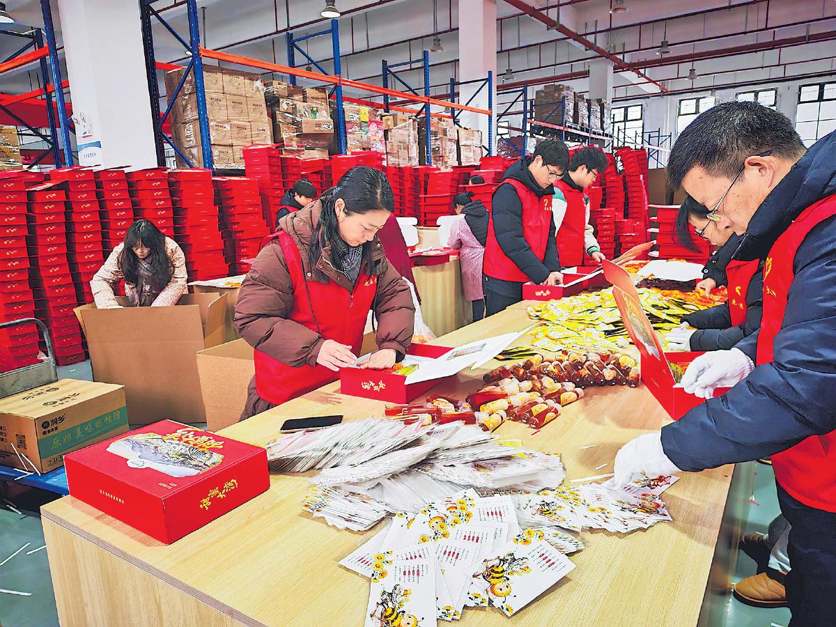 今年1月,金寨邮政和花石乡政府抽调人员帮扶合作社组装“甜蜜大湾”礼盒2.5万份。