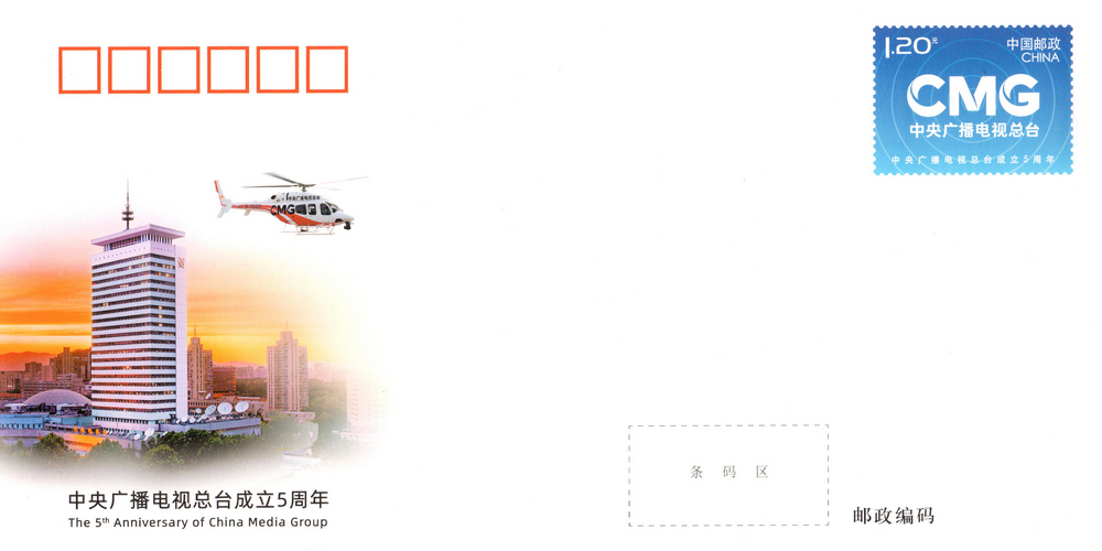 中国邮政定于2023年3月21日发行《中央广播电视总台成立5周年》纪念邮资信封1套1枚。详情如下: