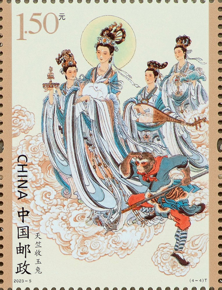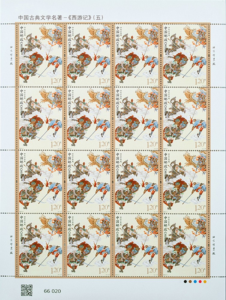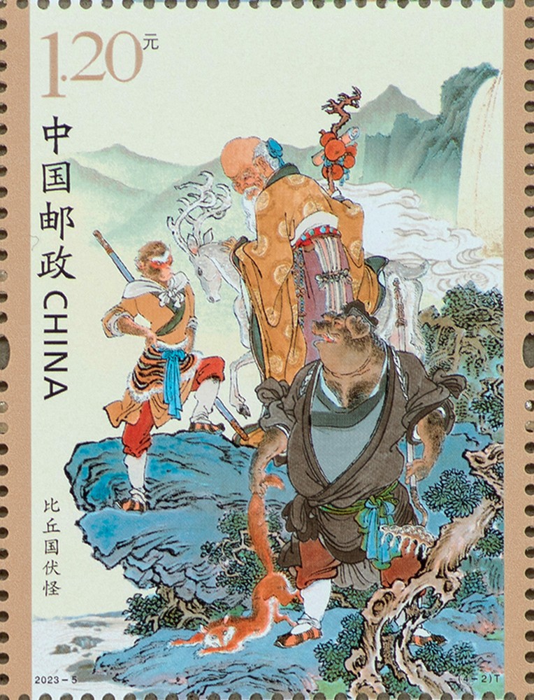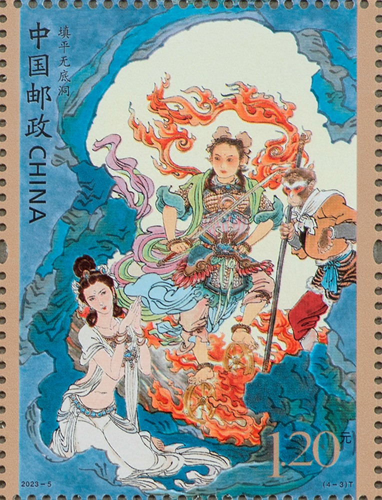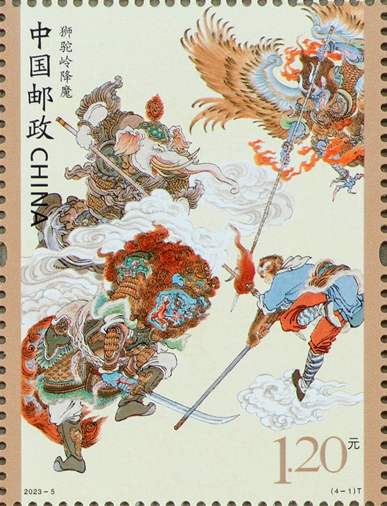 中国邮政定于2023年4月27日发行《中国古典文学名著——<西游记>(五)》特种邮票1套4枚,小型张1枚。邮票图案名称分别为:狮驼岭降魔、比丘国伏怪、填平无底洞、天竺收玉兔,小型张为:五圣成正果。全套邮票面值为11.10元。邮票计划发行数量为850万套,版式二发行数量99万版,小型张计划发行数量为598万枚,另发行四方连邮票折一本,计划发行数量15万本。